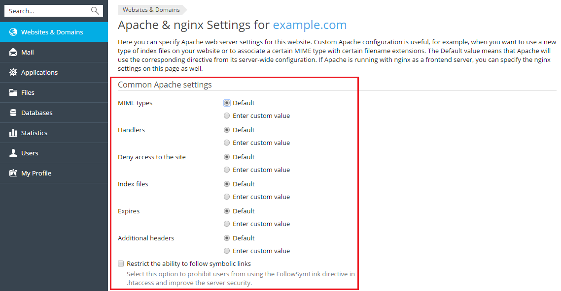 Apache 和 nginx 有些设置可以在域名层进行自定义。这些设置位于 网站与域名 > domain name > Apache 与 nginx 设置。这些设置分成两组: