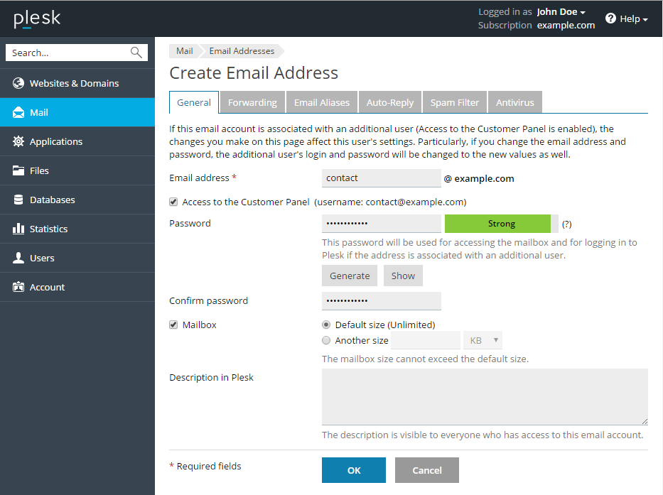 - Indiquez le volume de la boîte mail ou utilisez le volume par défaut défini par la politique du fournisseur ou par votre pack de services.