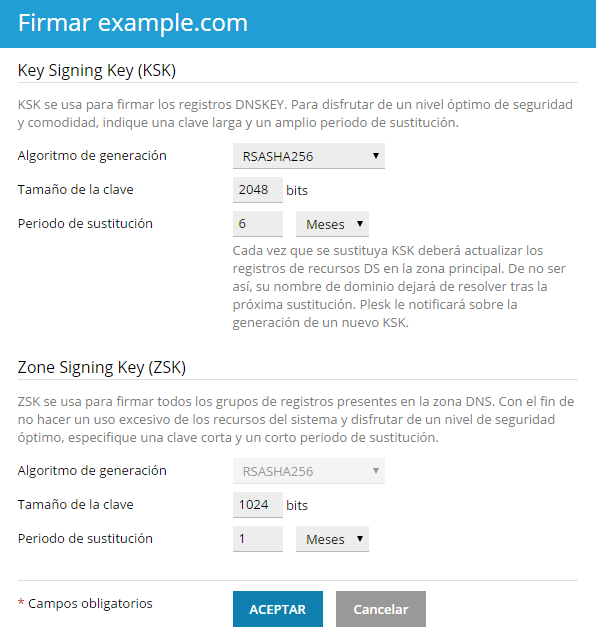 Zone Signing Key se actualiza automáticamente. Los valores recomendados le ayudarán a no consumir tantos recursos del sistema sin poner en riesgo la seguridad.