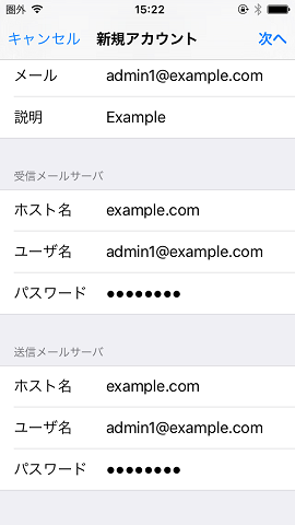 - [次へ]をタップします。次の画面の上部で[IMAP](受信メールメッセージのコピーをサーバに保持したい場合)または POP を選択します。次に、受信メールサーバと送信メールサーバの詳細を指定します。両サーバに対し、以下の情報を入力する必要があります。
