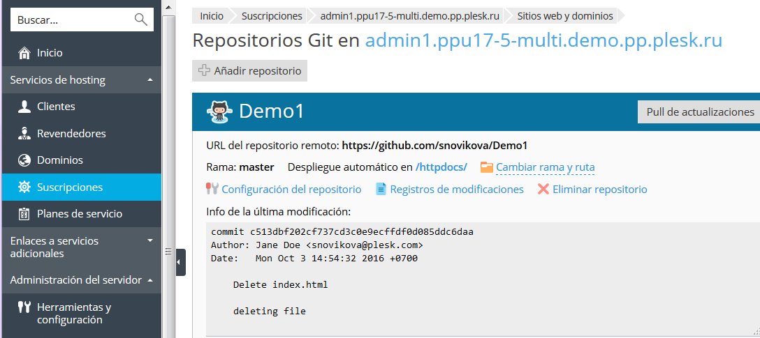 Por defecto, Plesk usa el modo Despliegue automático. Esto significa que una vez se ha hecho push de un archivo al repositorio, este se despliega en el directorio de destino de forma inmediata. Puede desactivar este modo siguiendo las indicaciones detalladas en la sección Selección del modo de despliegue .